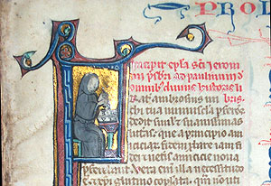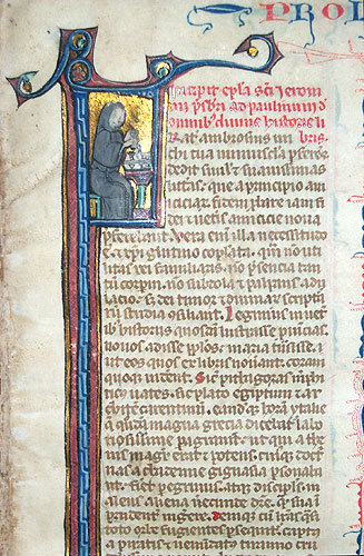 (fol. 1r) Initial 'F'(rater), with Jerome (not nimbed), dressed in a grey habit, with knotted cord, writing his letter to Damasus; he appears to have written 'ALE | VIA'; the face damaged; the head of the initial nine lines high, the trunk extending the full height of the text into the lower margin.