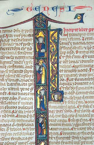(fol. 4v) Initial 'I'(n), with seven Creation scenes; the full width of the inter-columnar space, and extending above and below the text area (Alexander & Temple, pl. XLI).