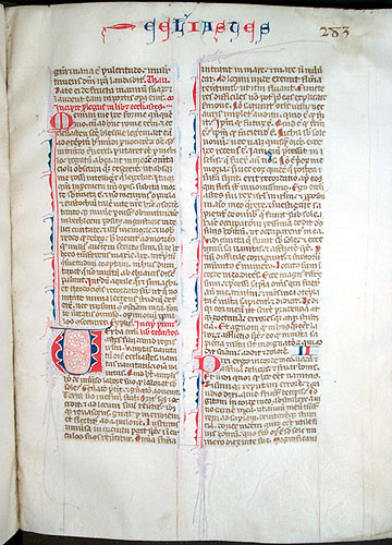 2. (fols. 273r-458r) Prologue S.457, Proverbs (fols. 273r-283r); prologue S.462, Ecclesiastes (fols. 283r-286v); Song of Songs (fols. 286v-288v); prologue S.468, Wisdom (fols. 288v-296v); S.26,1 ('Multorum nobis ') (fol. 296v-297r), Ecclesiasticus (fols. 297r-316v); prologue S.482 (fol. 317r, rubric on 316v), Isaiah (fols. 317r-340r); prologue S.487 (fol. 340r), Jeremiah (fols. 340r-367v); Lamentations (fols. 367v-370r), with the prayer of Jeremiah (fol. 370r), the prologue to Ezekiel S.492 (fol. 370r-v), and Ezekiel 1:1-4:2 (fols. 370v-371v) written in error before Baruch, marked 'vacat' in various places, and crossed through before rubrication; prologue S.491 (fol. 371v), Baruch (fols. 371v-375r); prologue S.492, Ezekiel (fols. 375r-399v); prologue S.494 (fols. 399v-400r), Daniel (fols. 400r-410r); prologue S.500 (fol. 410r-v); prologue S.507, Hosea (fols. 410v-414r); prologues S.511, S.510 (fol. 414r-v), Joel (fols. 414v-415v); prologues S.515, S.512 (fols. 415v-416r), S.513, Amos (fols. 416r-419r); prologues S.519, S.517, Obadiah (fol. 419r-v); prologues S.524, S.521 (fols. 419v-420r), Jonah (fol. 420r-v); prologue S.526 (fols. 420v-421r), Micah (fols. 421r-422v); prologue S.528 (fols. 422v-423r), Nahum (fol. 423r-v); prologue S.531 (fols. 423v-424v), Habakkuk (fols. 424v-425v); prologue S.534, Zephaniah (fols. 425v-426v); prologue S.538 (fols. 426v-427r), Haggai (fols. 427r-428r); prologue S.539, Zechariah (fols. 428r-432r); prologue S.543, Malachi (fols. 432r-433r); prologues S.547 (fol. 433r-v), S.553 (fols. 433v-434r), S.551, I Maccabees (fols. 434r-448r); II Maccabees, 'Explicit machabei liber secundus. Versus habens mille octingentos.' (fols. 448r-458r); fols. 458v-459v originally blank, fol. 459v now with an 'Index Noui Testamenti', with folio references, apparently by Crowe (see under Provenance).