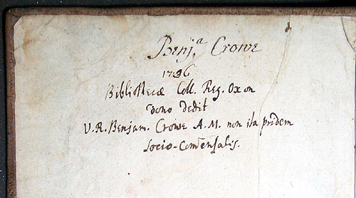 3. Benjamin Crowe, of Queen's College (on whom see BROU: matriculated 1707 aged 18; B.A., M.A.; vicar of Gilling, Yorkshire, 1742): signed 'Benja. Crowe' (upper pastedown).