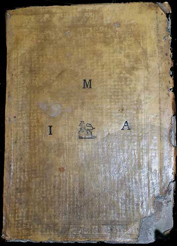 Formerly sewn on three straps laced into pasteboards covered with 16th(?)-century parchment, each cover framed with blind fillets and stamped in the centre in black with a cap surmounted by a crowned lion passant, within the initials 'I. M. A.' (to the left, above, and to the right, respectively); the top of the spine inscribed 'Herold(?) | Scotch | Armory(?)', and with a paper label inscribed 'K' above printed '21', and a trace of another modern(?) blue paper label lower down; the edges of the leaves coloured red; the manuscript now removed from the binding (preserved separately in the same box), and rebound in plain limp parchment. The binding is presumably contemporary with the repairs to the first few leaves, and with the quire signatures.