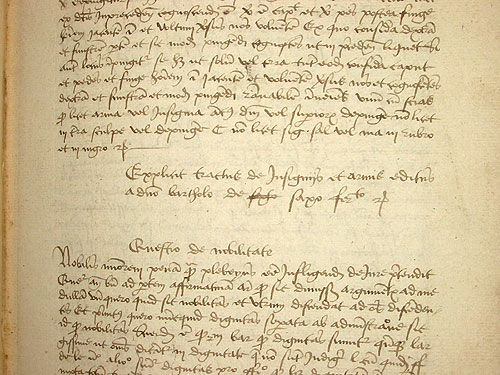 23. (fols. 113v-117r) Bartolus de Saxoferrato (Bartolo di Sassoferrato): 'De Insignis et armis gratia Insigniorum que quis portat in vexillo et clipeis videamus primo an hic sit licitum in rubro et in nigro. Explicit tractus de Insigniis et armis editus a domino bartholo de [saxto crossed through] saxo ferrato.' (ed. E. J. Jones, Medieval heraldry: some fourteenth-century heraldic works (Cardiff, 1943), pp. 226-52).