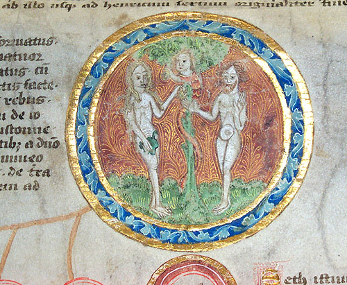 One fine circular miniature: Adam and Eve either side of the Tree, the woman-headed serpent offering the fruit to Eve, who holds a fruit with one hand and offers it to Adam, covering her genitalia with a leaf held in her other hand; Adam to the right, about to accept the fruit, his other hand also raised; on a reddish background with 'gold scrolls'; within two concentric gold circular frames enclosing a band of blue foliate pattern (top of membrane 1).