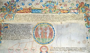 One four-line intitial 'A'(dam) in gold on a red and blue 'quartered' ground with white tracery. The main line of descent with names in a series of circles, framed alternately in red or blue, the whole edged in gold.