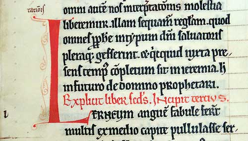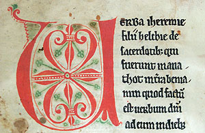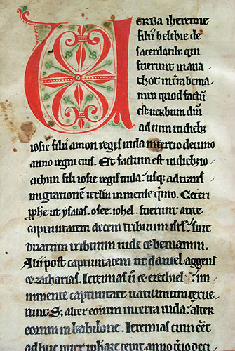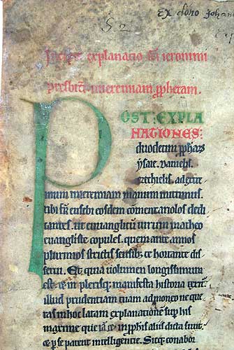 1. (fols. 1r-94v) Jerome, Commentary on Jeremiah, in six books: 'Incipit explanatio sancti ieronimi presbiteri; in ieremiam prophetam. Post: explanationes: duodecim prophetarum ysaie. Danielis. ezechielis. ... Sed iam propositum opus est. aggrediendum. Explicit prologus. Incipit liber primus. Uerba iheremie filii helchie [Jeremiah 1:1-3] Ceteri prophete ut ysaias. osee. iohel. fuerunt ante captiuitatem decem tribuum israel; ut apostolus ait dedit dona hominibus.' (Lambert, BHM, II (1969), no. 211, citing the present manuscript at p. 107; Dekkers, CPL, no. 586; ed. CSEL, 74, pp. 1-440).