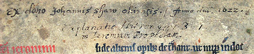 4. Queen's College, given by Shaw in 1622: inscribed 'Ex dono Johannis Shaw okiensis. Anno dni. 1622.' (fol. 1r; cf. MS. 309, which he had given to the College in 1617; both are listed in the Library Benefactors book, MS. 556: 'Jo. Shaw Alumnus 1617 moriens legavit | Augustinum verbis Domini MS. Fol. | Hieronymum in Jeremiam MS. Fol.'); inscribed below this by another later hand 'Explanatio Hieronimi | in Ieremiam Prophetam.'; included in Langbaine's mid 17th century catalogue and in MS. 555, with the shelfmark Arch. B. 3. 1.; included in Bernard, CLM, p. 29. no. 932 (MS. 8); inscribed with former shelfmarks '3. 1' (fol. 1r); 'S. 2' (fols. 1r, 2r), and the top of the former spine with a small paper label printed '2'.